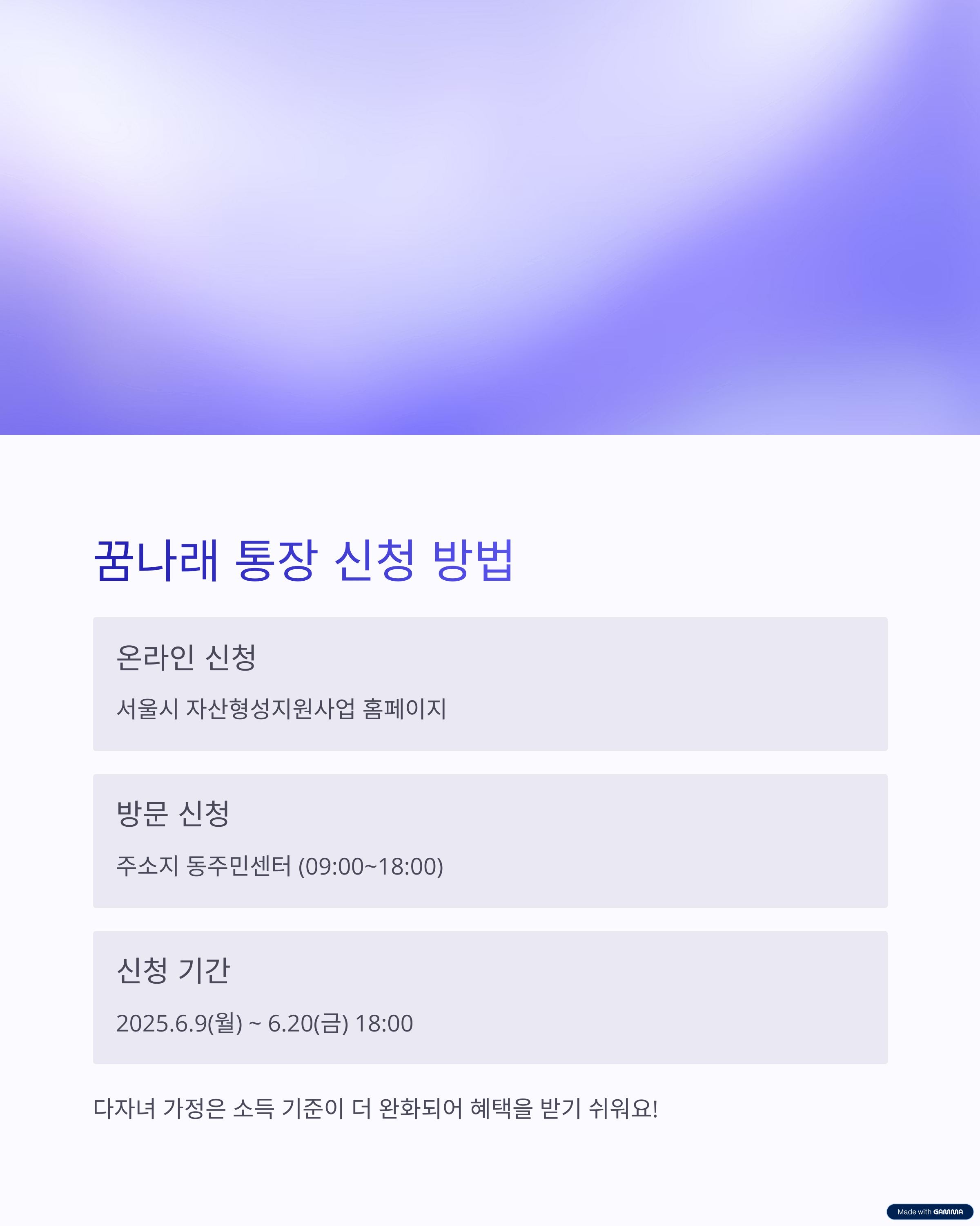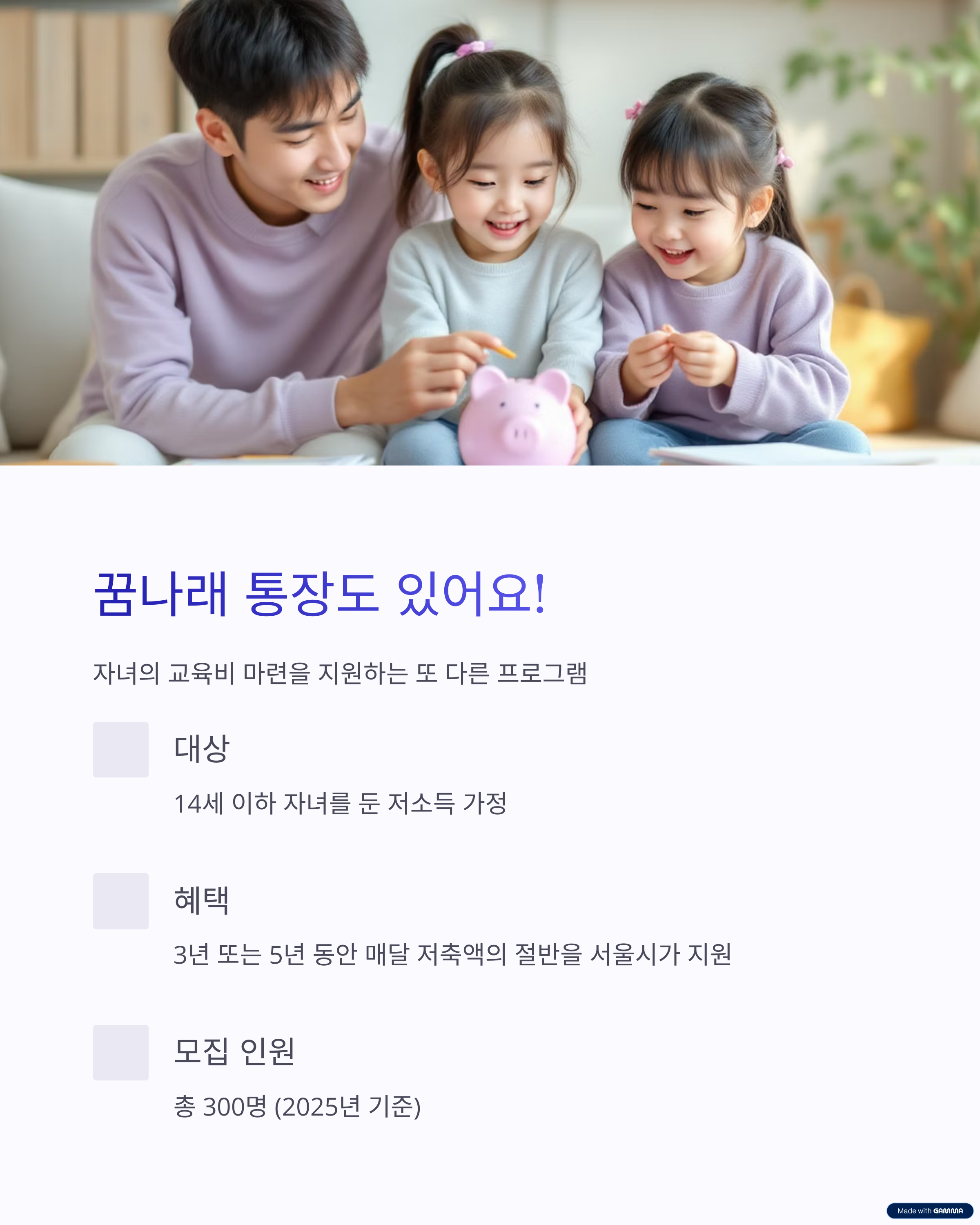 서울시에서는 자녀의 교육비 마련을 지원하는 「꿈나래통장」의 2025년 신규 참여자를 아래와 같이 모집합니다.