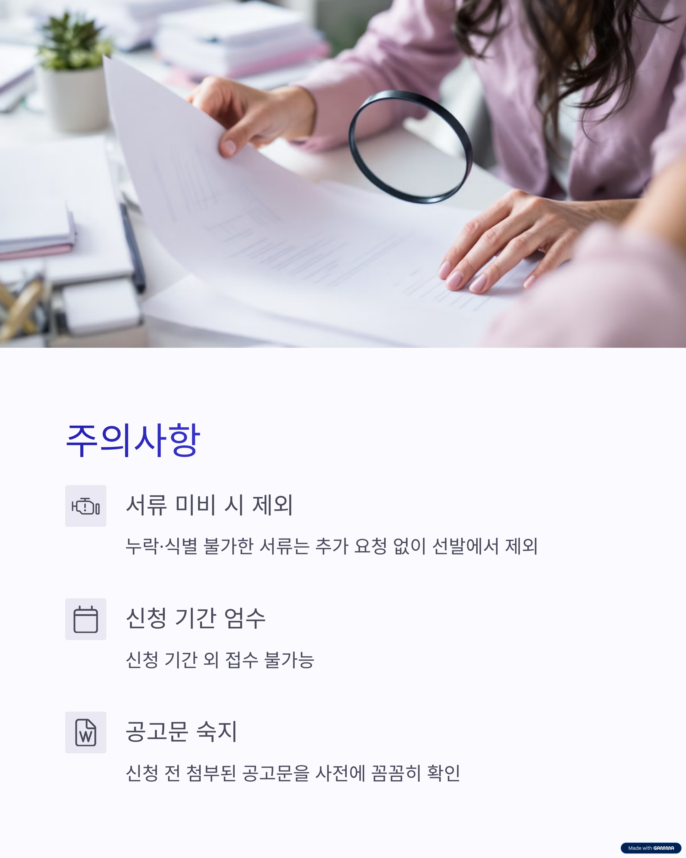 ※ 제출한 서류에 미비(누락·식별 불가) 있는 경우 별도 추가(보충)서류를 요청하지 않고 참여자 선발에서 제외 유의