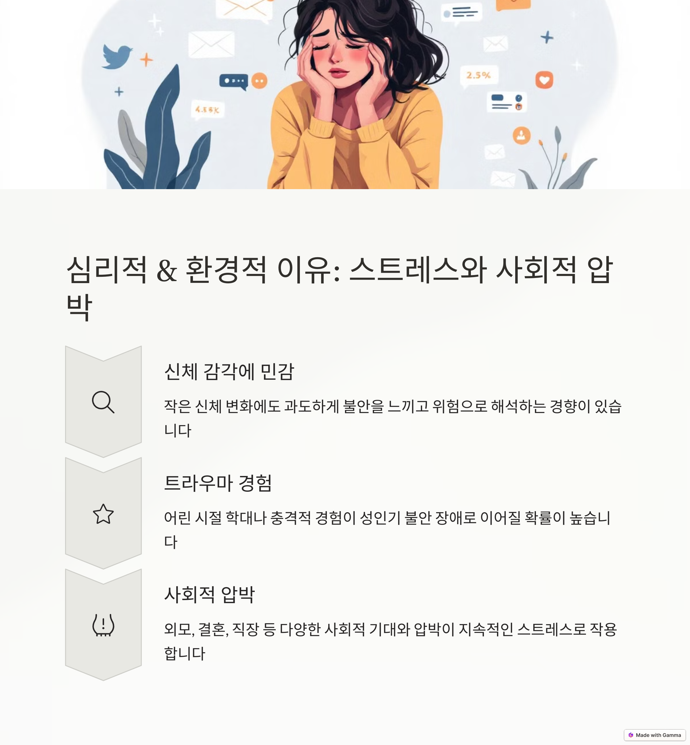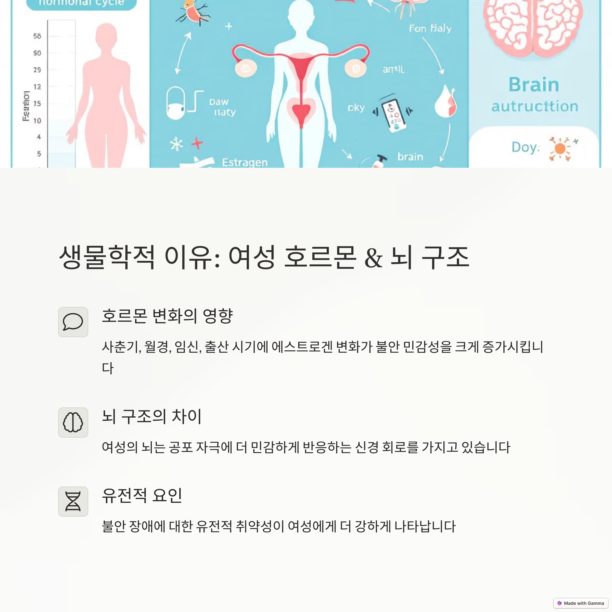 심리적 요인으로는 여성들이 내적 신체 감각에 더 민감하고 이를 과도하게 해석하는 경향이 있습니다. 예를 들어, 심박수 증가나 숨 가쁨 같은 증상을 생명 위협으로 인식하며 불안을 증폭시키고 공황 발작을 유발할 수 있습니다. 또한 여성은 스트레스와 감정적 반응에 더 민감한 경향이 있어 공황장애의 발병 위험이 높습니다.