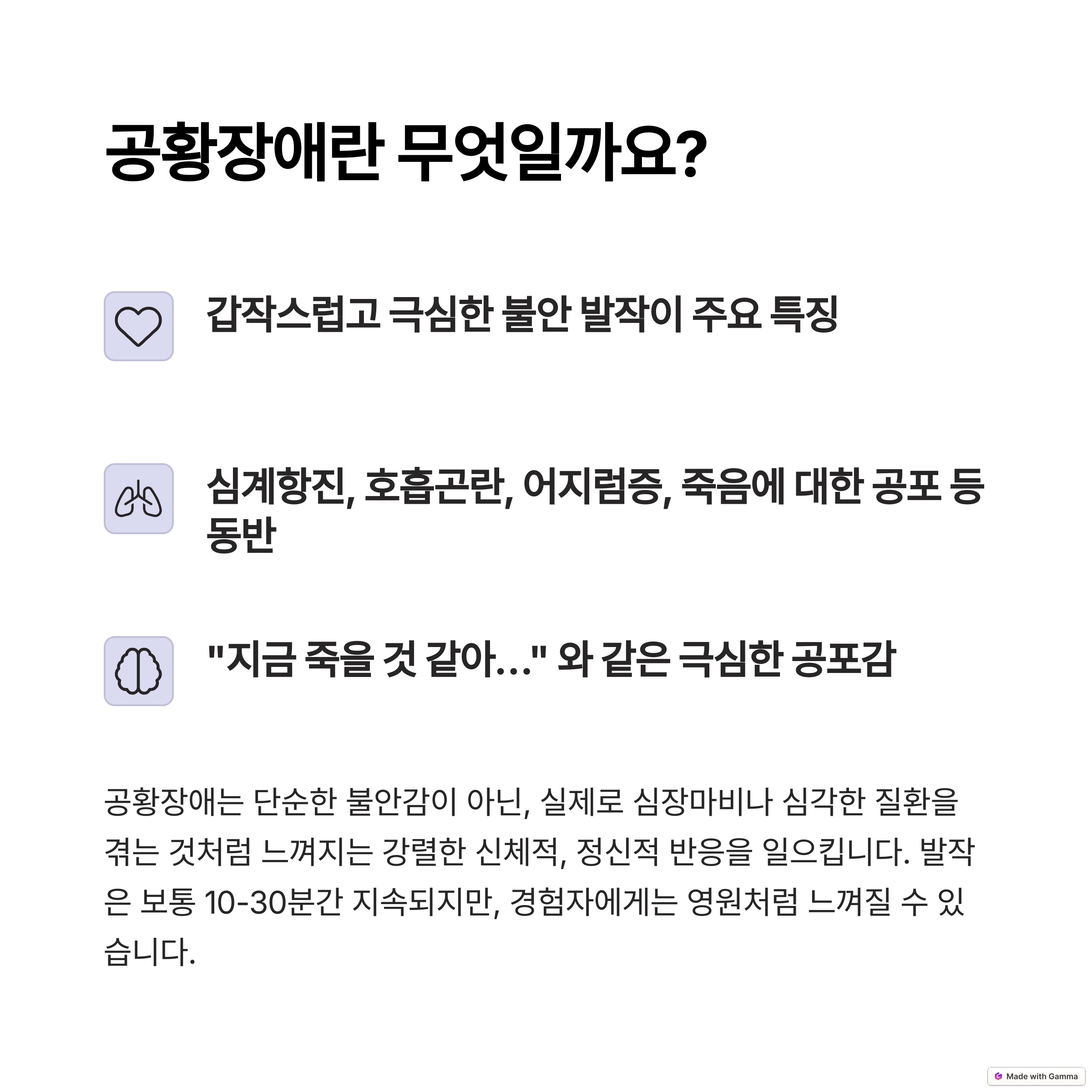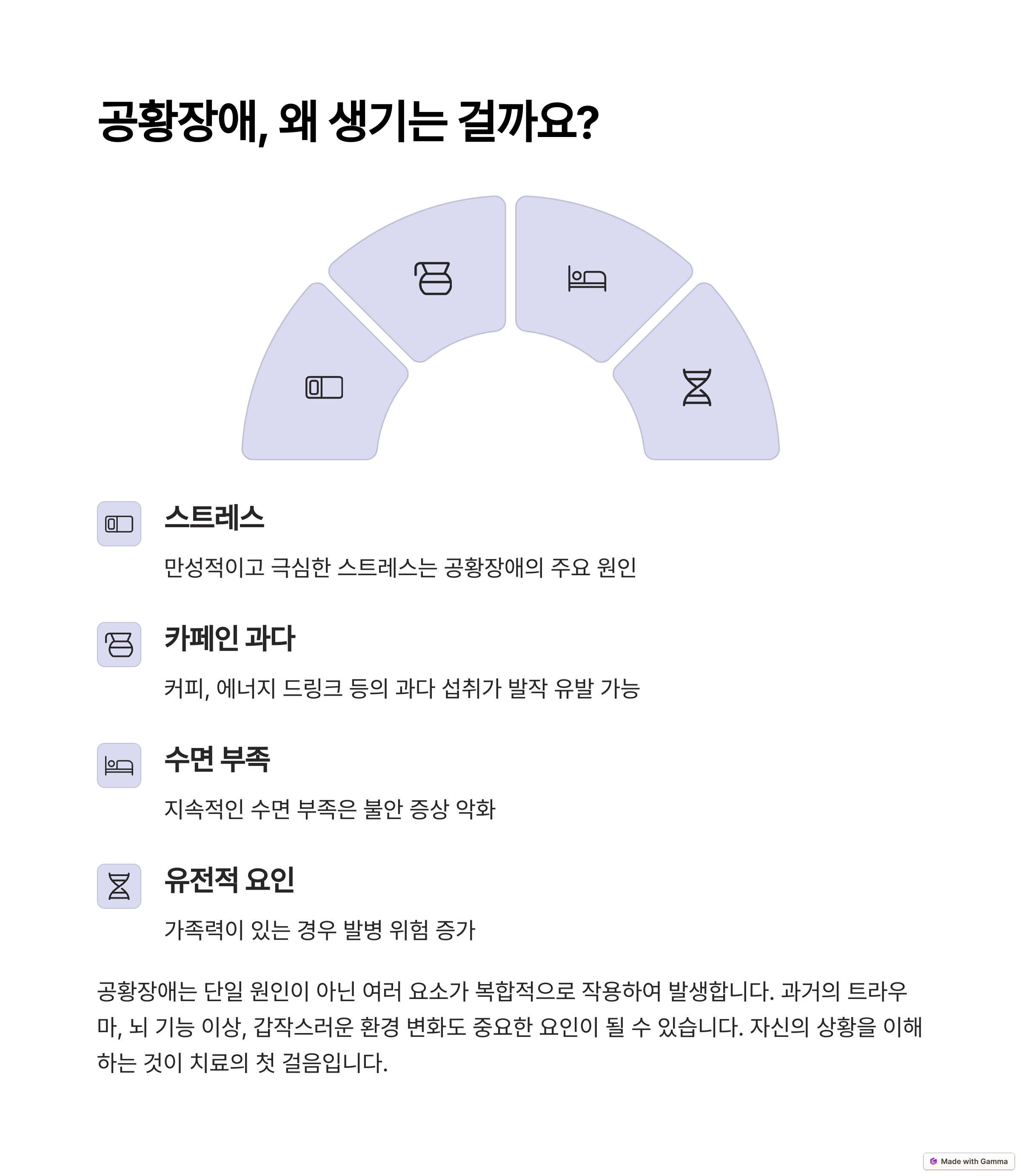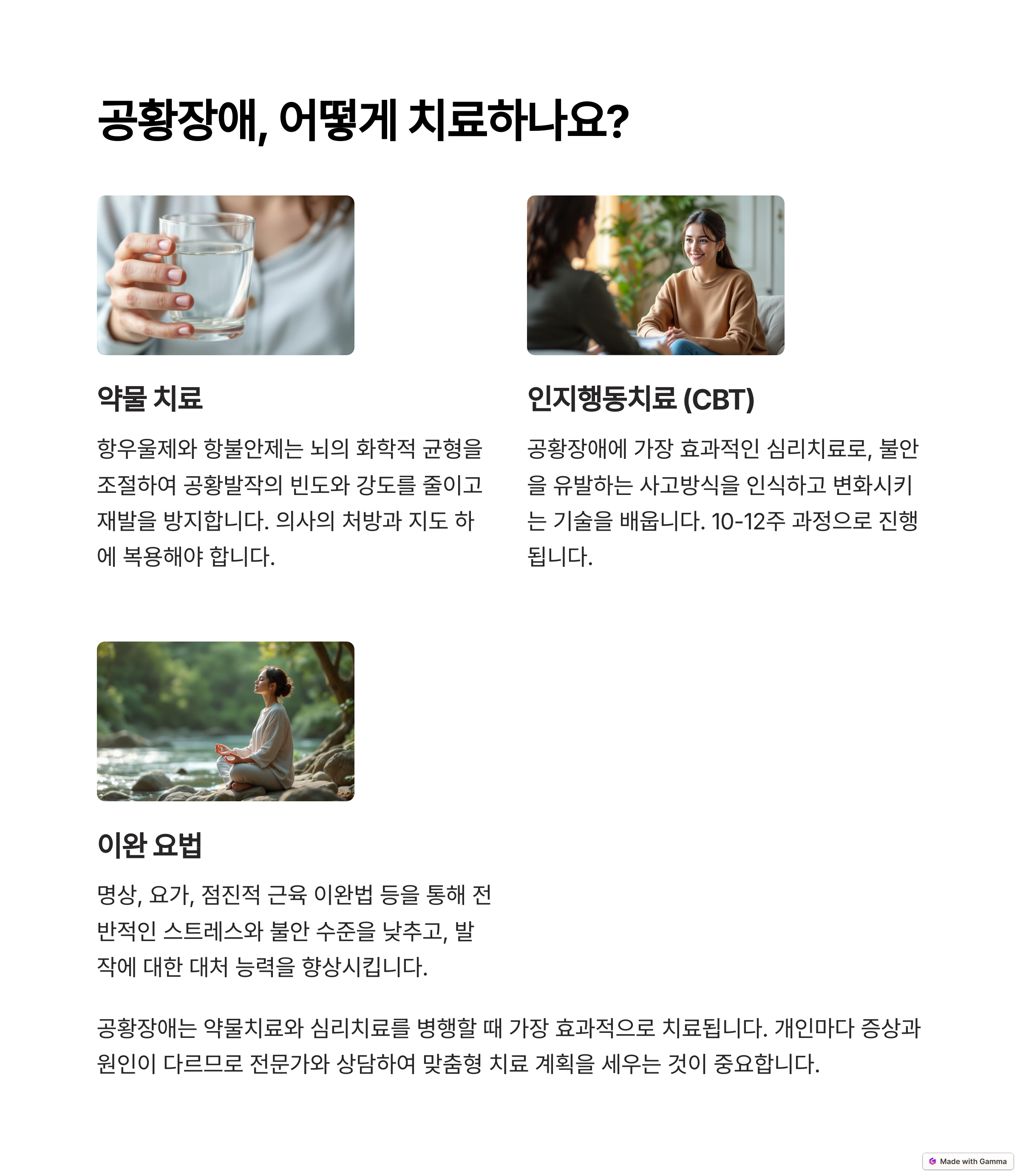 공황장애는 갑작스럽고 극심한 불안을 특징으로 하는 정신 건강 장애로, 다양한 신체적 및 감정적 증상을 동반합니다. 스트레스와 관련된 요인들이 공황 발작의 주요 유발 요인으로 작용하며, 조기 치료가 중요합니다. 심호흡과 같은 이완 기술, 약물 치료, 심리 치료가 공황장애 관리에 효과적입니다. 공황장애는 신체적 위험을 초래하지 않지만, 정신적 고통을 줄이기 위해 적절한 치료가 필요합니다.