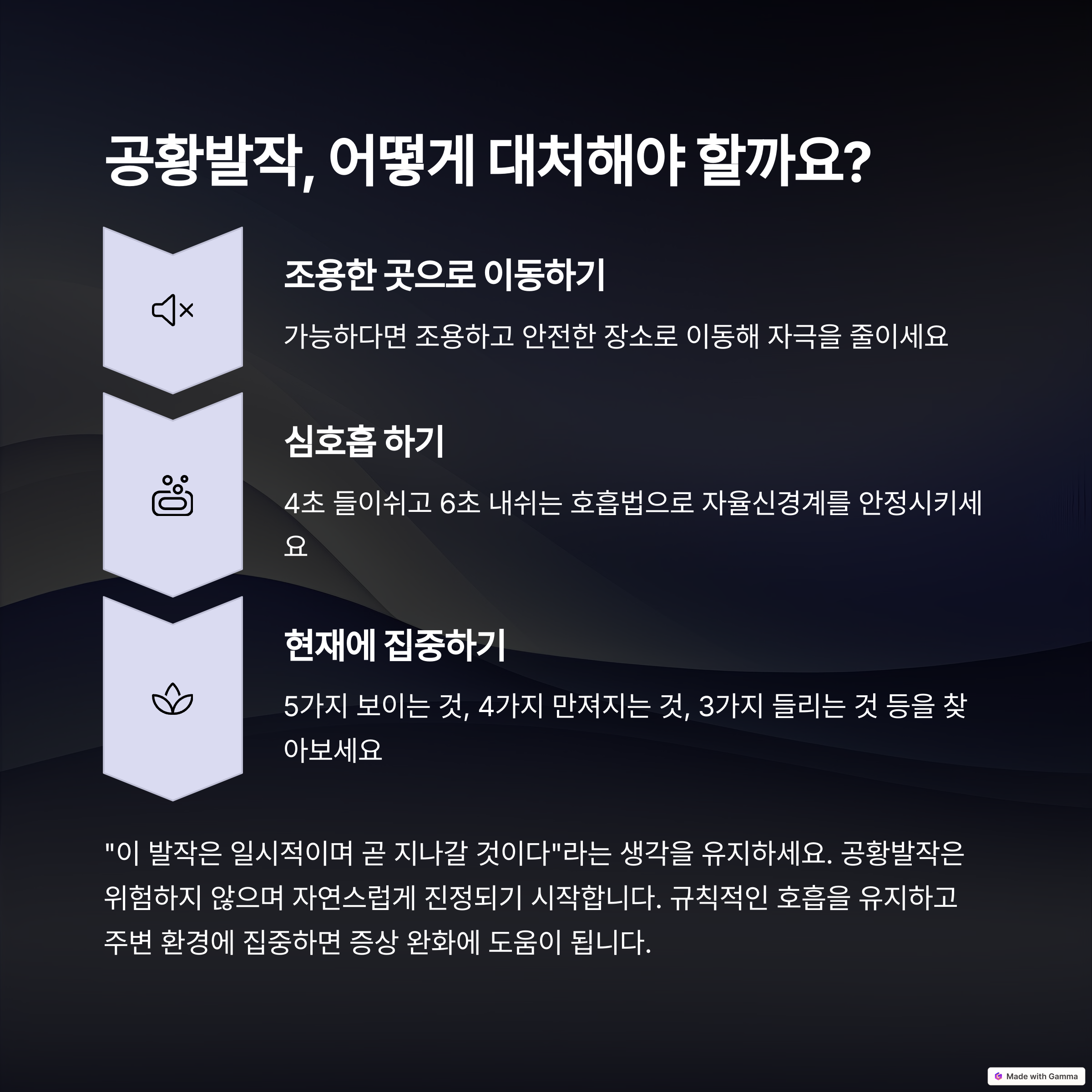 대처법으로는 심호흡과 같은 이완 기술이 중요합니다. 심호흡은 불안을 줄이고, 현재에 집중하도록 도와줍니다 또한, 운동과 충분한 수면이 스트레스 관리에 도움이 됩니다3. 공황 발작이 발생할 때는 조용한 곳으로 이동하고, 주변 환경에 집중하는 것이 도움이 될 수 있습니다