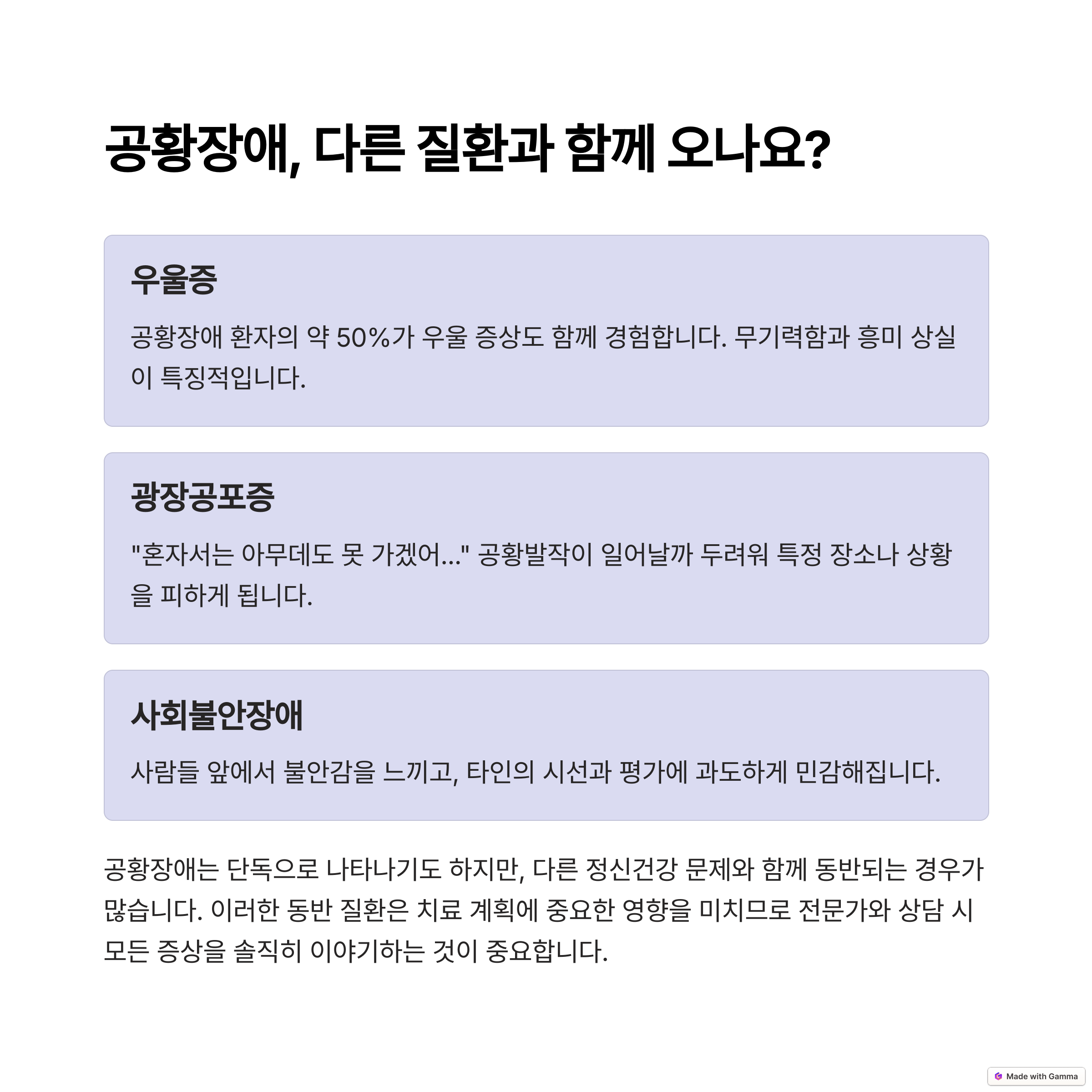 공황장애는 때때로 우울증과 같은 다른 정신 건강 문제와 함께 발생할 수 있습니다. 이러한 경우 치료가 더 복잡해질 수 있습니다.또한, 광장 공포증과 같은 다른 불안 장애와 함께 나타날 수 있으며, 이는 공황 발작을 더 심화시킬 수 있습니다