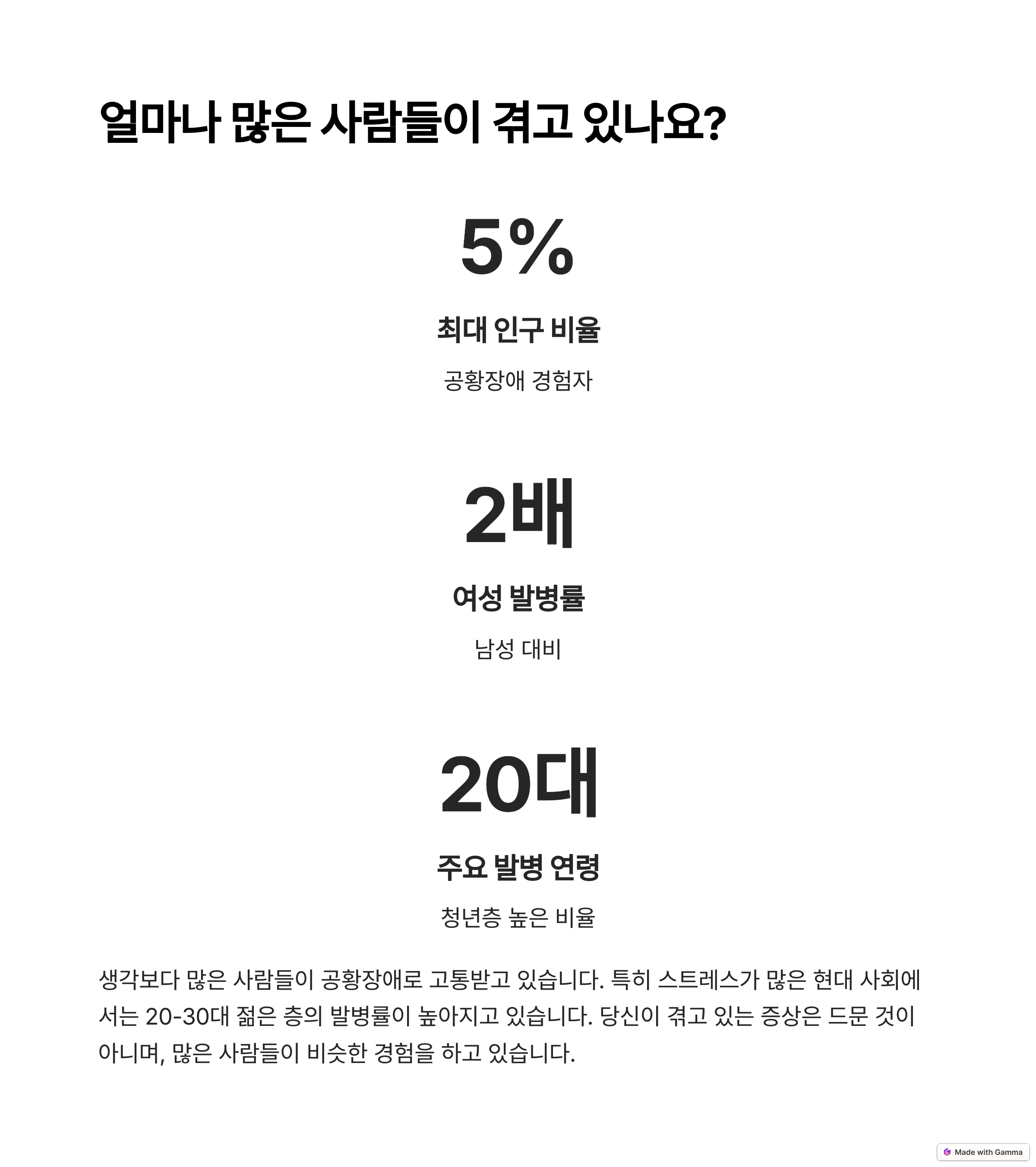 공황 발작은 전체 인구의 약 3~5.6%가 경험하며, 공황장애는 인구의 1.5~5%에서 발생합니다. 공황장애는 주로 청소년기 후반이나 청년기 초기에 시작되며, 여성에게서 더 흔하게 나타납니다. 특히, 여성은 남성보다 약 2배 더 많이 공황장애를 경험합니다.