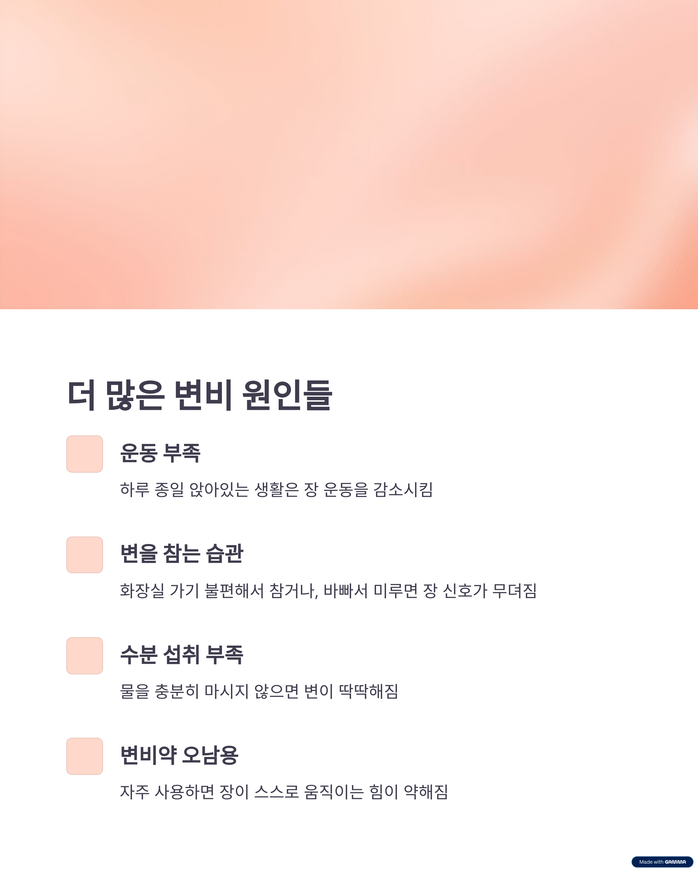 변비는 단순히 화장실에서 힘든 시간을 보내는 것만이 아니라, 피부 트러블, 복부 팽만, 체중 증가, 심리적 스트레스 등 다양한 문제로 이어질 수 있습니다.