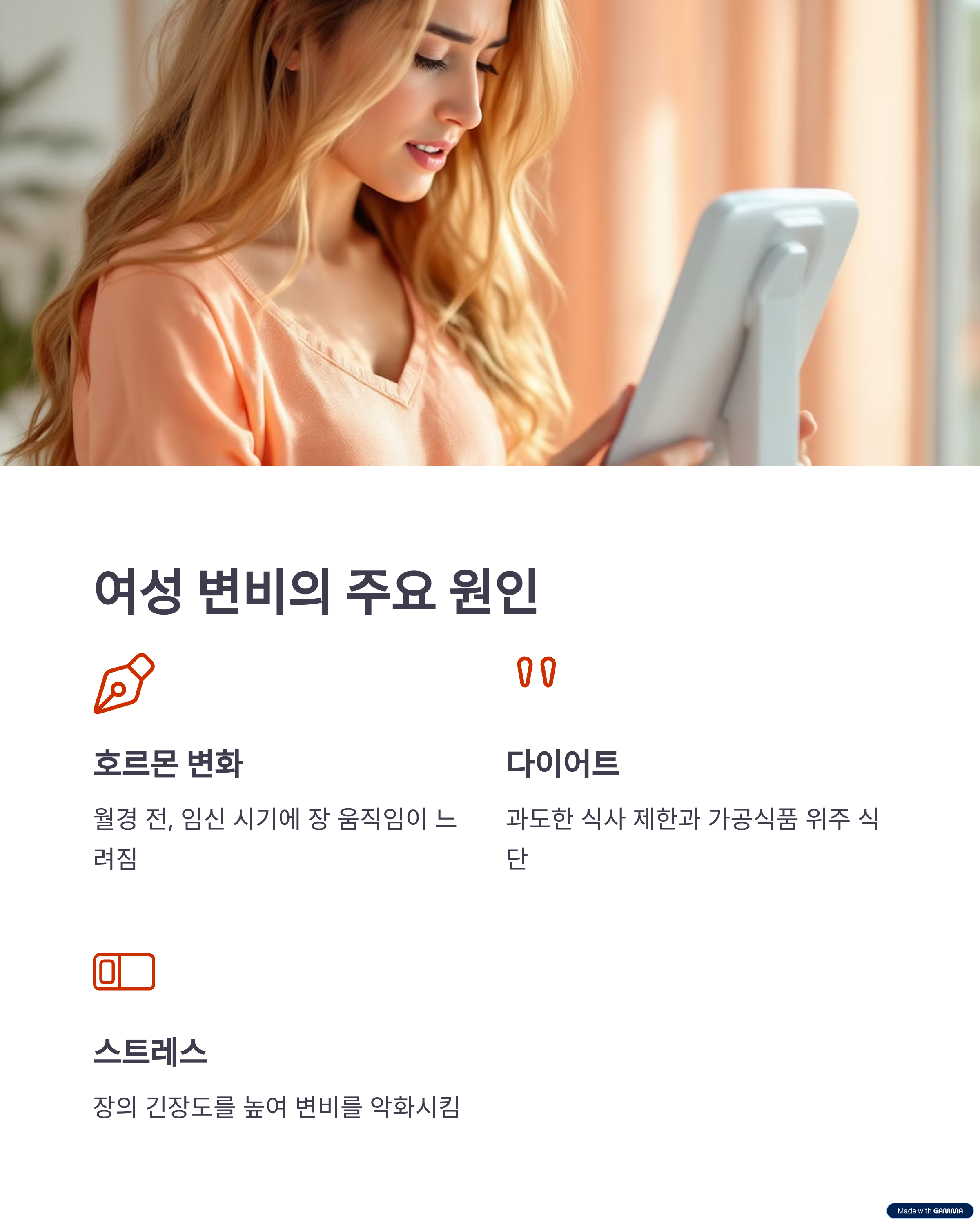 특히 20대 30대 여성은 남성보다 변비를 더 자주 겪으며, 이는 호르몬 변화, 다이어트, 운동 부족, 스트레스 등 다양한 원인과 관련이 있습니다.
