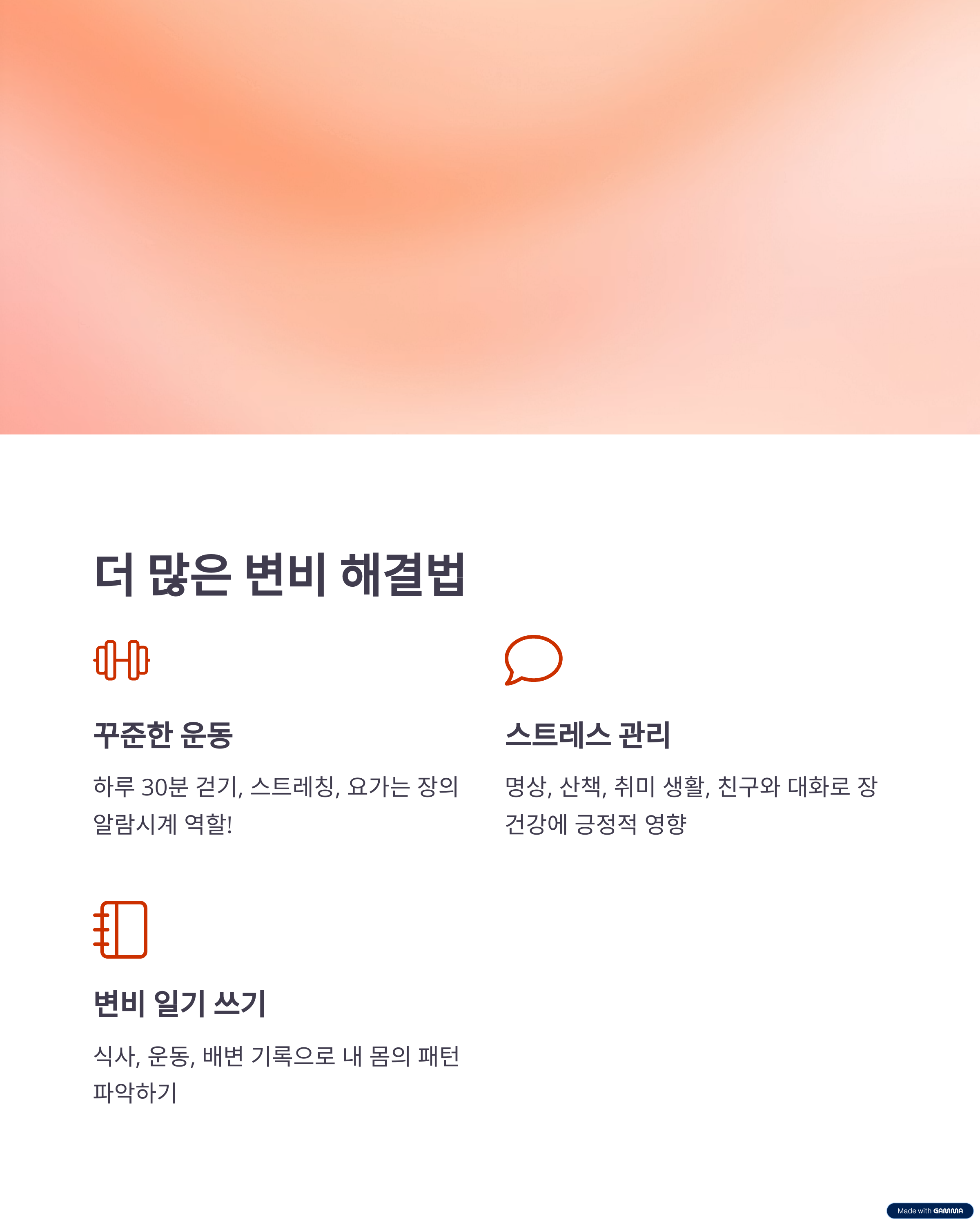 - 하루 종일 앉아 있거나, 걷기·스트레칭이 부족하면 장도 게을러집니다.