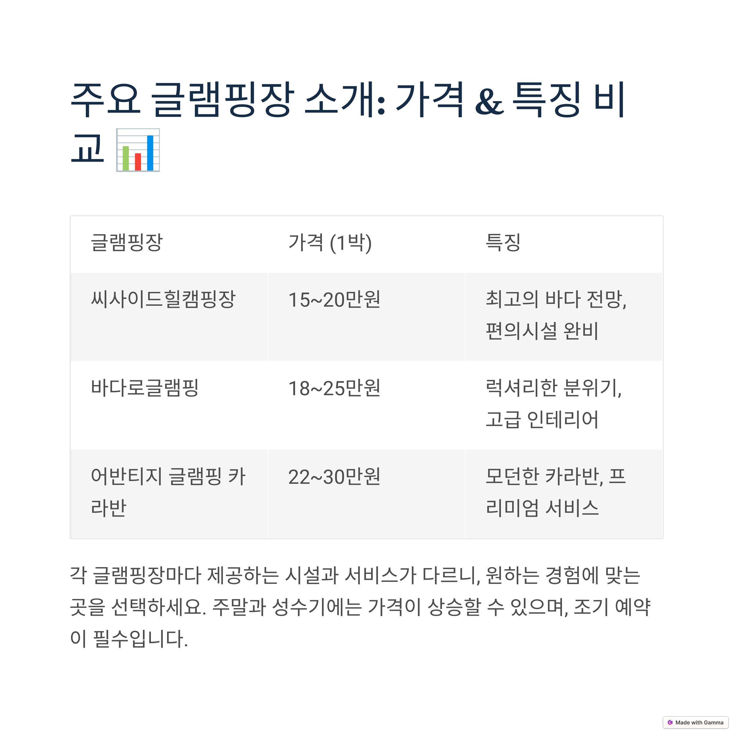 강화도의 글램핑장은 자연 속에서 편안한 휴식을 취하며 다양한 활동을 즐길 수 있는 최적의 장소입니다. 추천된 글램핑장을 비교하여 자신에게 맞는 곳을 선택하고, 할인 혜택과 주의사항을 고려하여 알뜰하게 즐겨보세요!