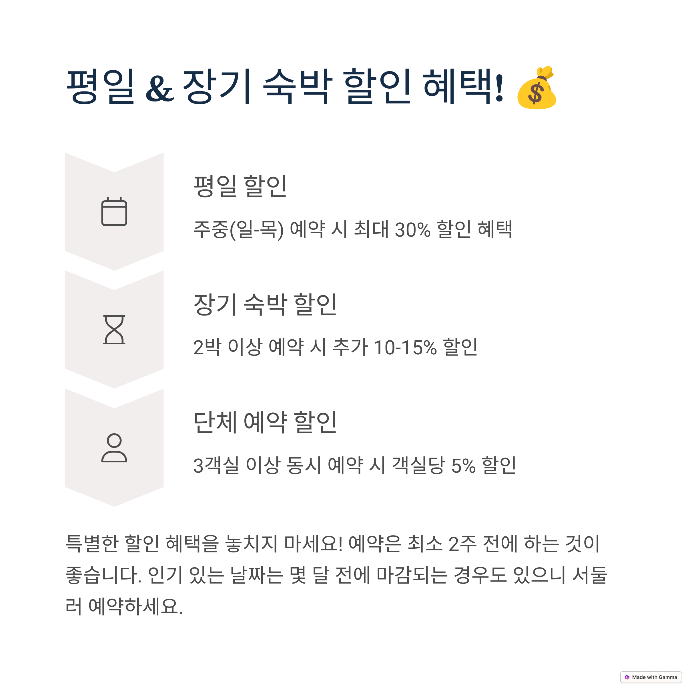 - 할인 혜택: 평일 예약 시 최대 10% 할인 가능