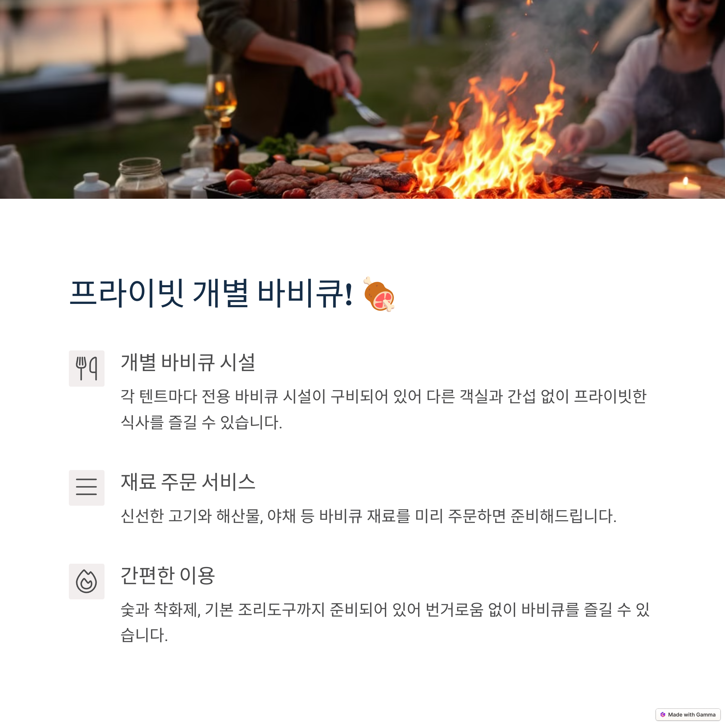 - 특징: 석양 감상 및 개별 바비큐 시설 제공