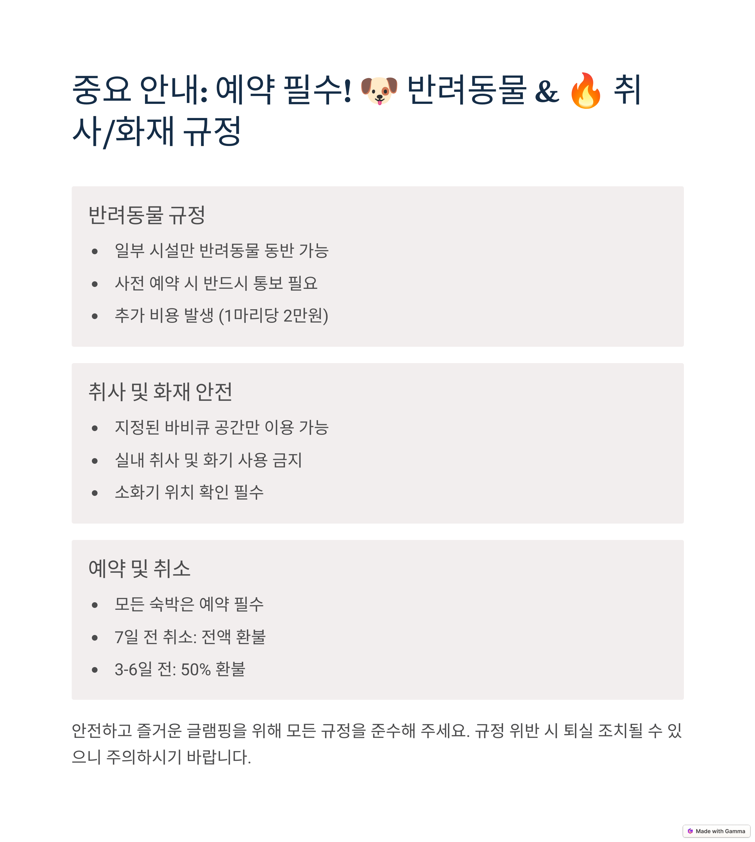 일부 글램핑장은 반려동물 동반이 금지되어 있으니 방문 전에 확인하세요. - 취사 및 화재 규정 준수