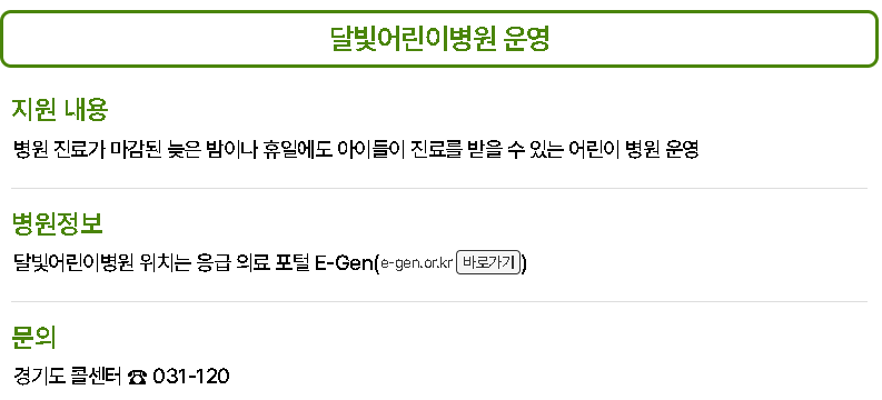 | 달빛어린이병원 운영 | 야간에도 소아진료 가능한 지정 병원 운영 |