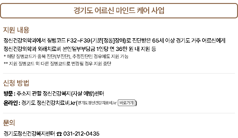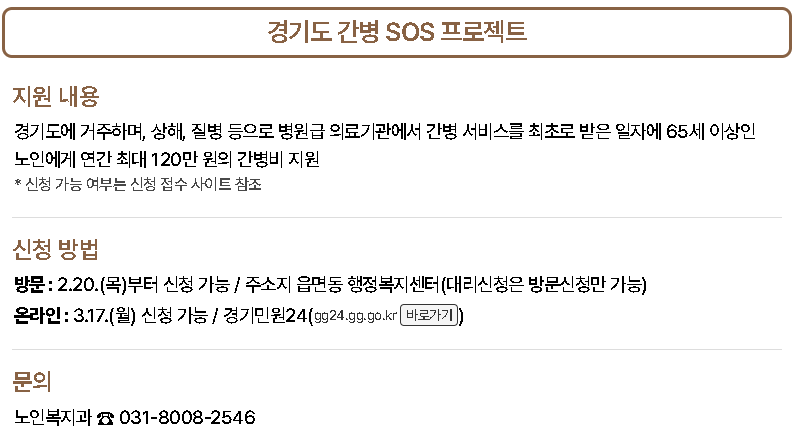 - 간병 SOS 프로젝트: 65세 이상 노인 대상 단기 간병비 지원