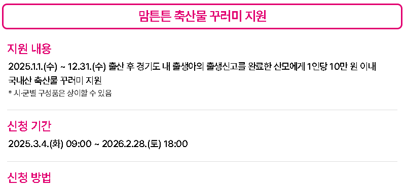 - 맘튼튼 축산물 꾸러미: 출산 후 산모에게 건강식 꾸러미 제공