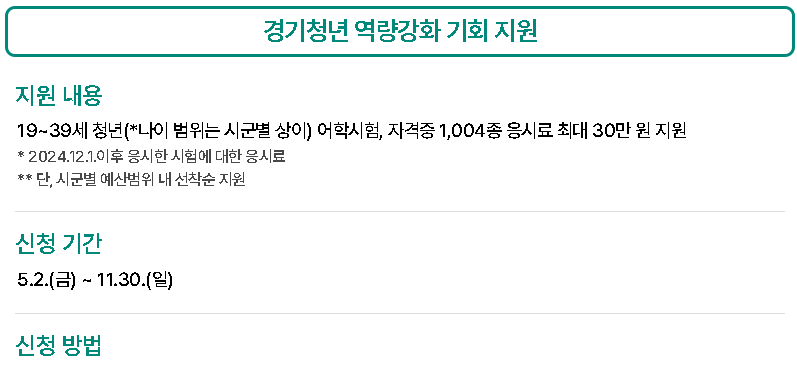| 청년 역량강화 응시료 지원 | 어학 및 자격증 시험 응시료 최대 30만원 지원 |