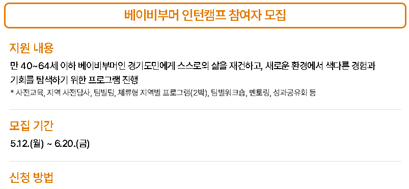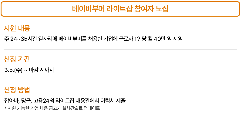 - 베이비부머 라이트잡: 주 24~35시간 근무 시 월 40만 원 인건비 지원