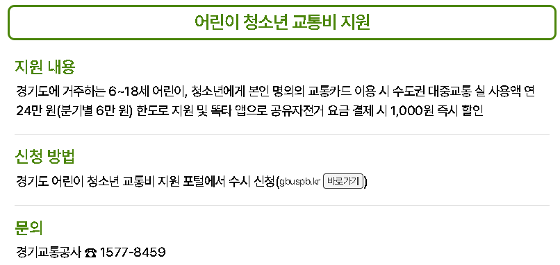 | 어린이·청소년 교통비 환급 | 6~18세 아동에게 교통비 정액 지원 |