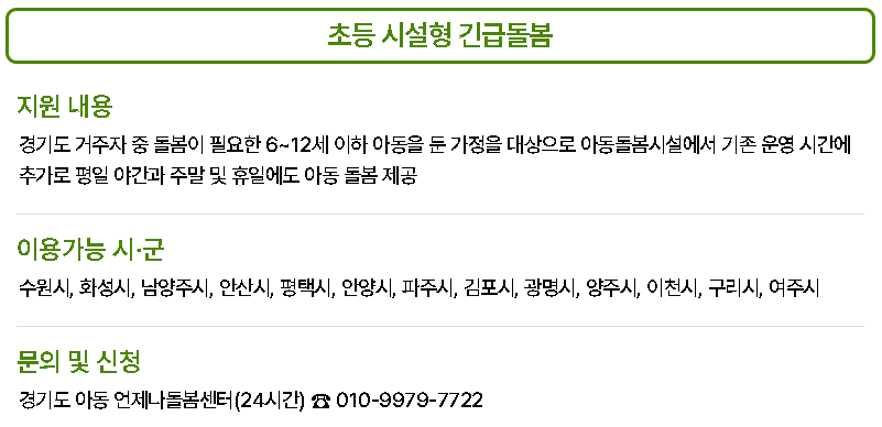 | 언제나 어린이집 긴급돌봄 | 야간 및 주말 돌봄 서비스 제공 |