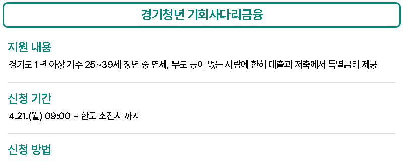 | 기회사다리금융 | 청년 대상 특별금리 저축 및 대출 지원 |
