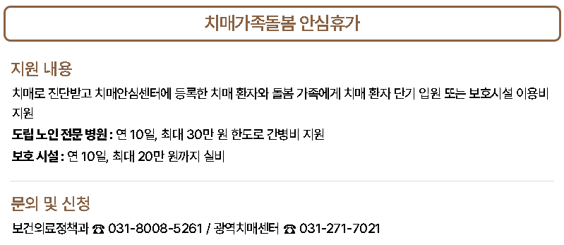- 치매가족 안심휴가제: 돌봄 제공자를 위한 휴가 지원 프로그램