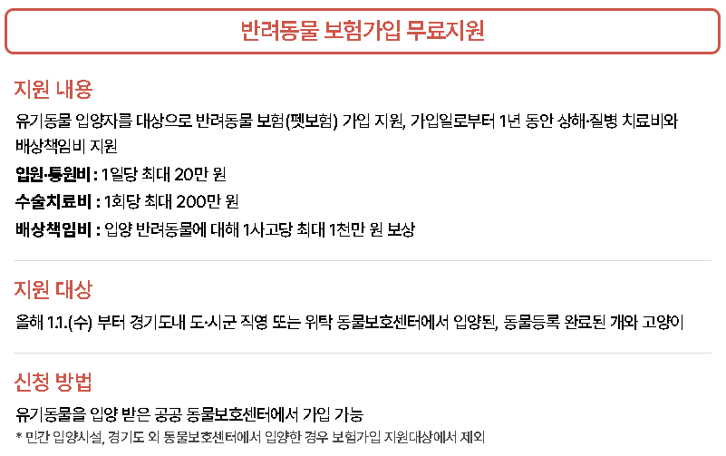 - 반려동물 보험 무료 가입: 유기동물 입양자에 한해 보험료 지원