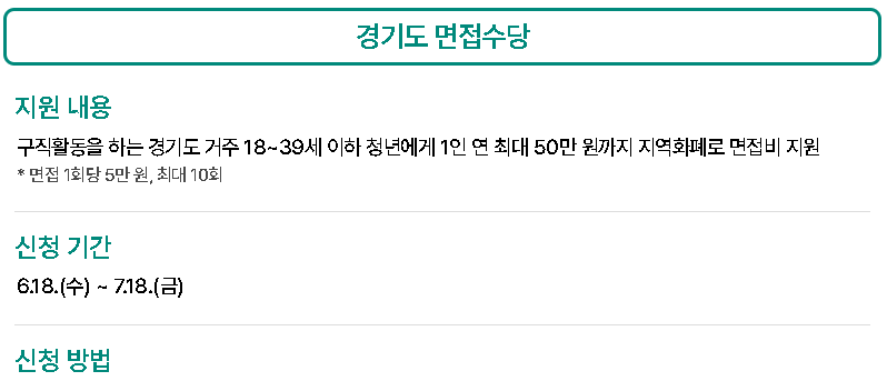 | 면접수당 지원 | 18~39세 구직 청년 면접 1회당 5만원, 최대 50만원 |
