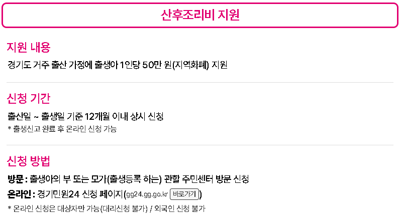 - 산후조리비 지원: 50만 원 현금성 지원