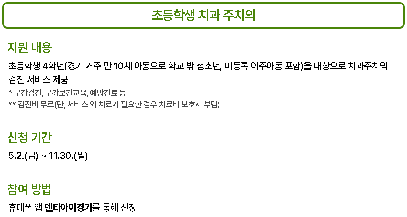 | 치과 주치의 서비스 | 초등학생 대상 정기 검진 및 예방 진료 제공 |