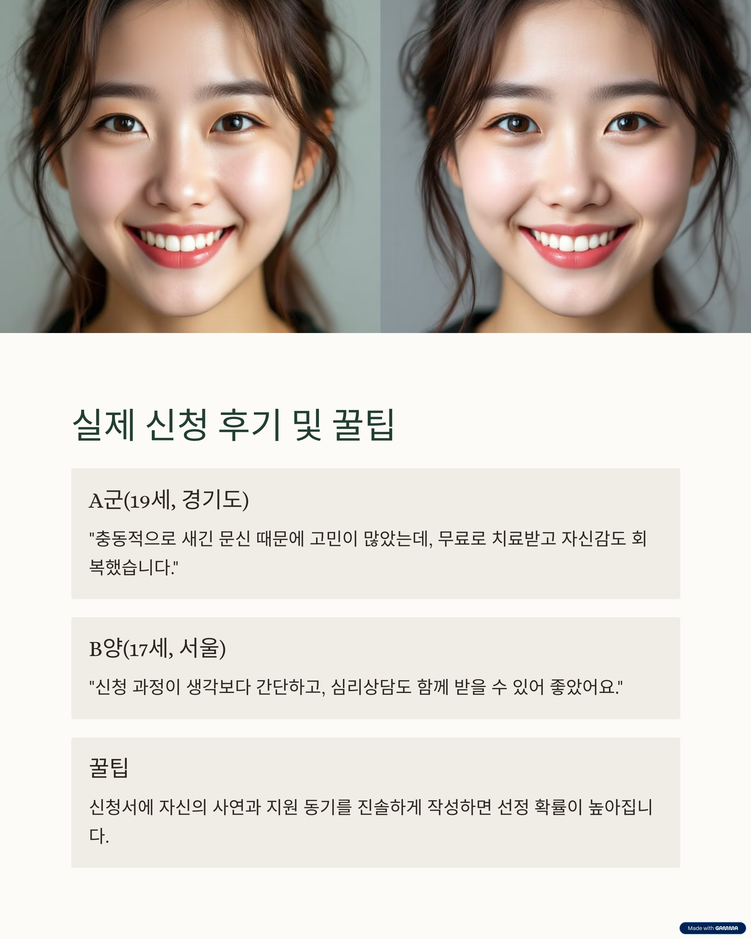 - B양(17세, 서울): "신청 과정이 생각보다 간단하고, 심리상담도 함께 받을 수 있어 좋았어요. 친구들에게 꼭 추천하고 싶어요."