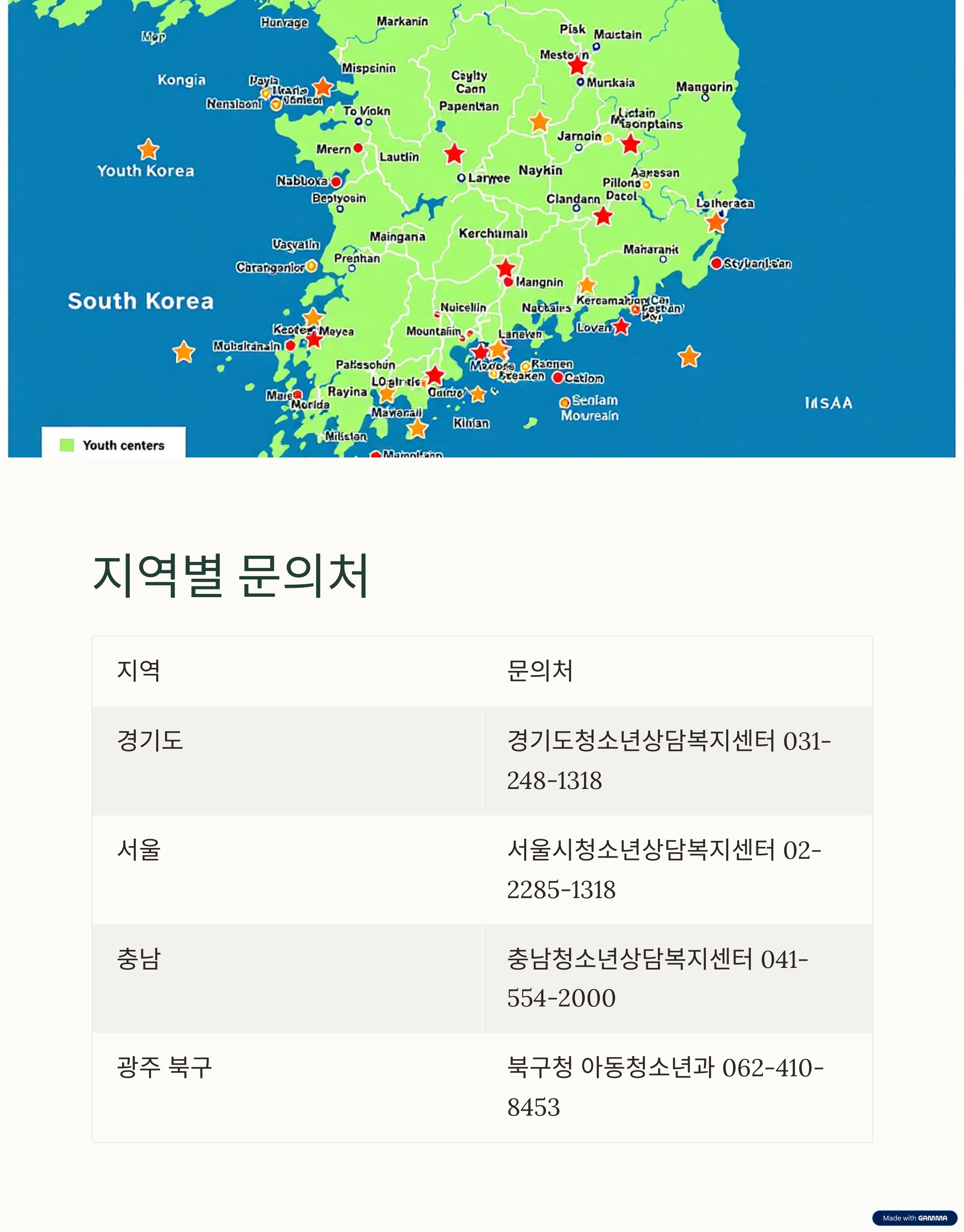 http://asanyouth.or.kr각 지역별 센터는 해당 홈페이지에서 위치, 연락처, 온라인 상담 등 다양한 정보를 확인할 수 있습니다