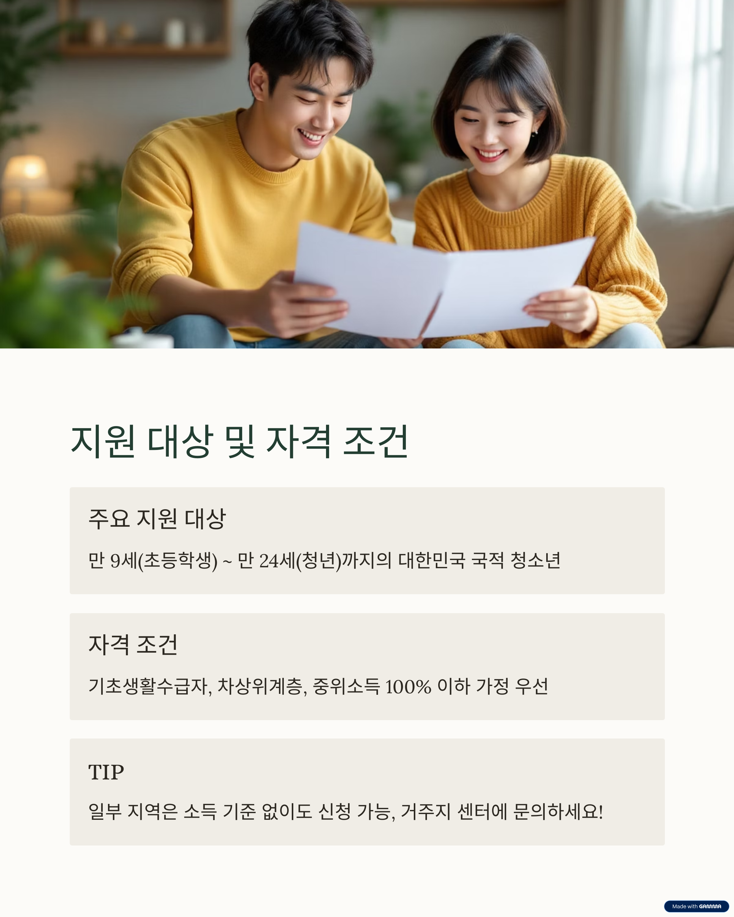 - 만 9~24세 청소년 중 소득 기준 충족자 또는 지역별 우선순위 대상자라면 누구나 신청 가능합니다.