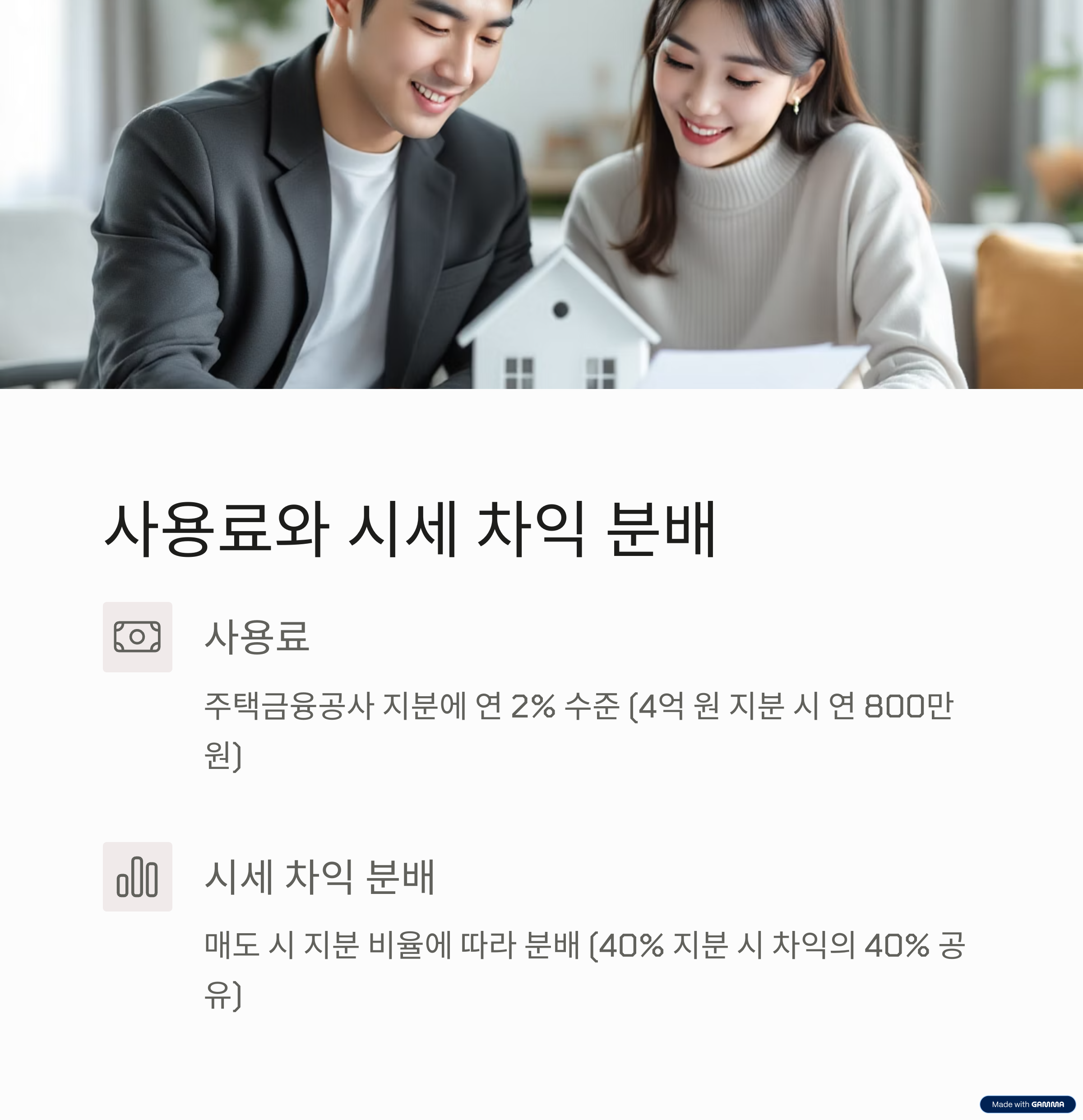 예를 들어, 4억 원의 지분에 대해 연 800만 원의 사용료를 부담하게 됩니다. - 시세 차익 분배: 주택을 매도할 때 주택금융공사와 시세 차익을 지분 비율에 따라 분배합니다.