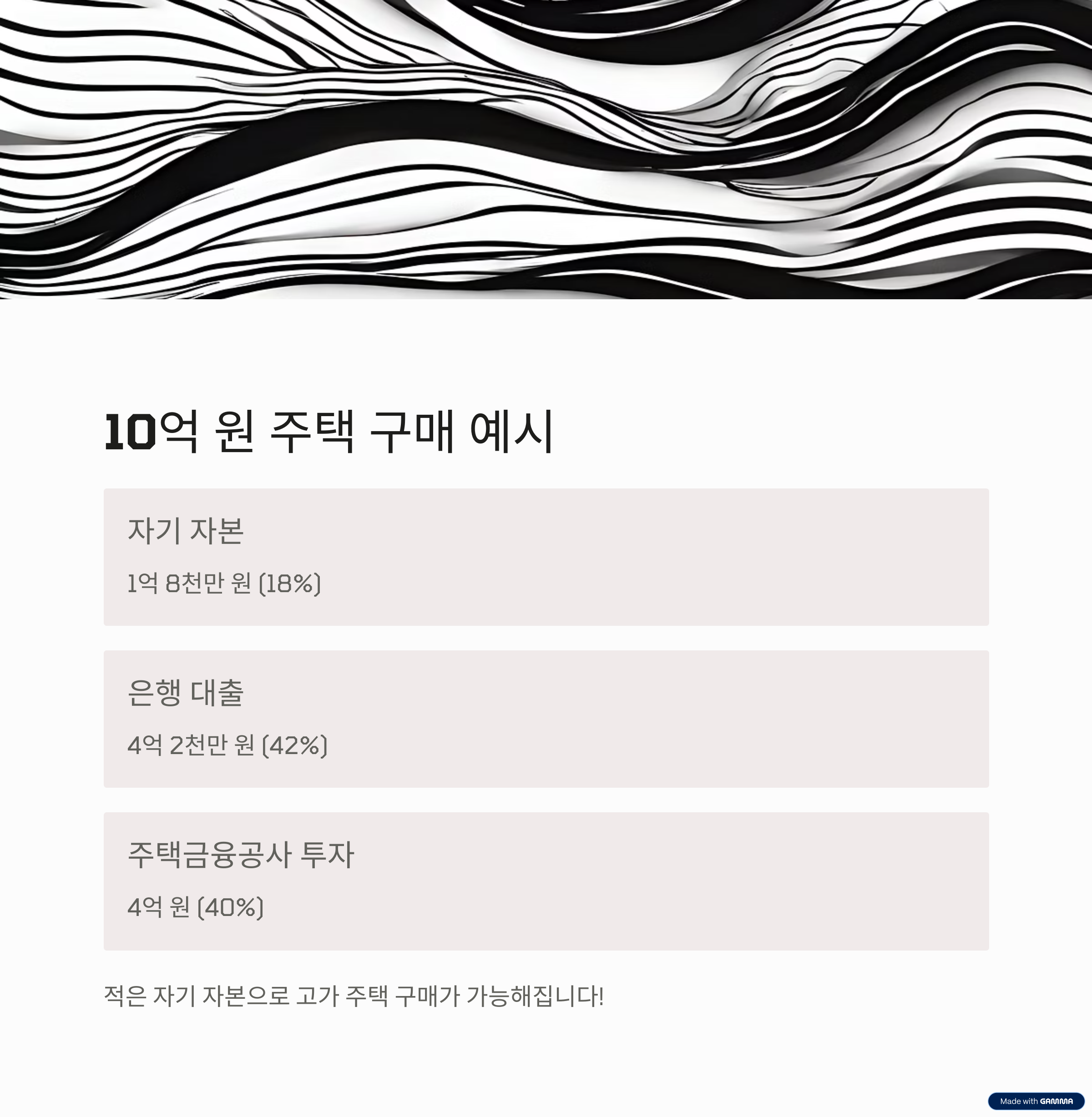 이 구조를 통해 1억 8천만 원의 자기 자본으로 10억 원짜리 주택을 구매할 수 있습니다.