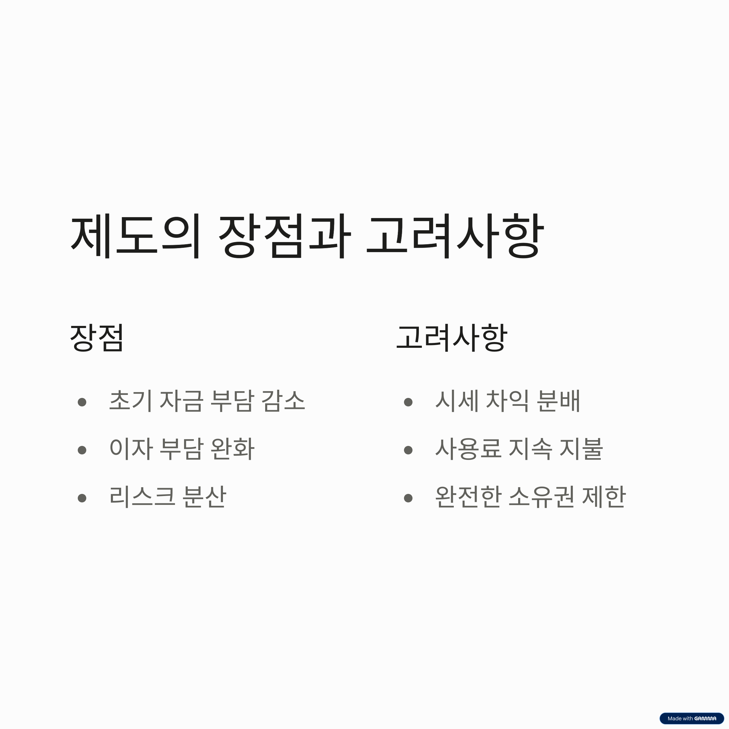 - 지분 매입 제한: 주택금융공사의 지분을 완전히 매입하지 않으면 완전한 소유권 확보 어려움