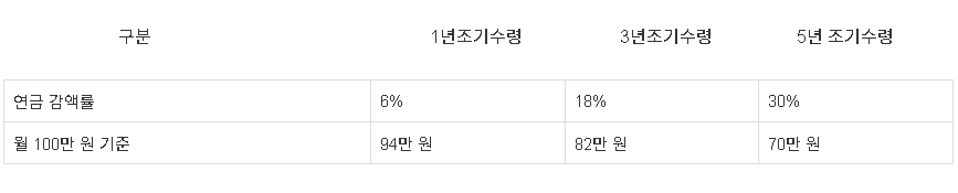 - 단, 빨리 받을수록 매년 연금액이 감액(1년당 6%, 최대 5년 30% 감액)