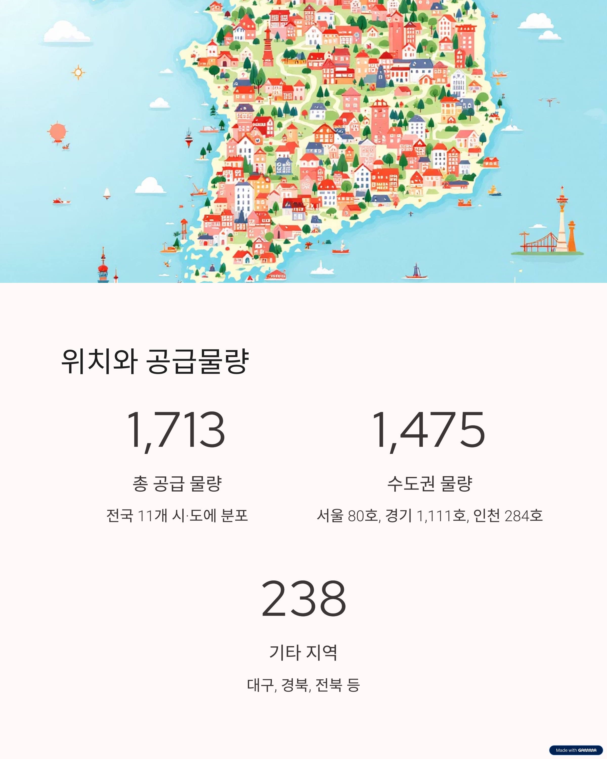 - 수도권 포함 전국 공급: 서울, 경기, 인천 등 주요 도시에 집중