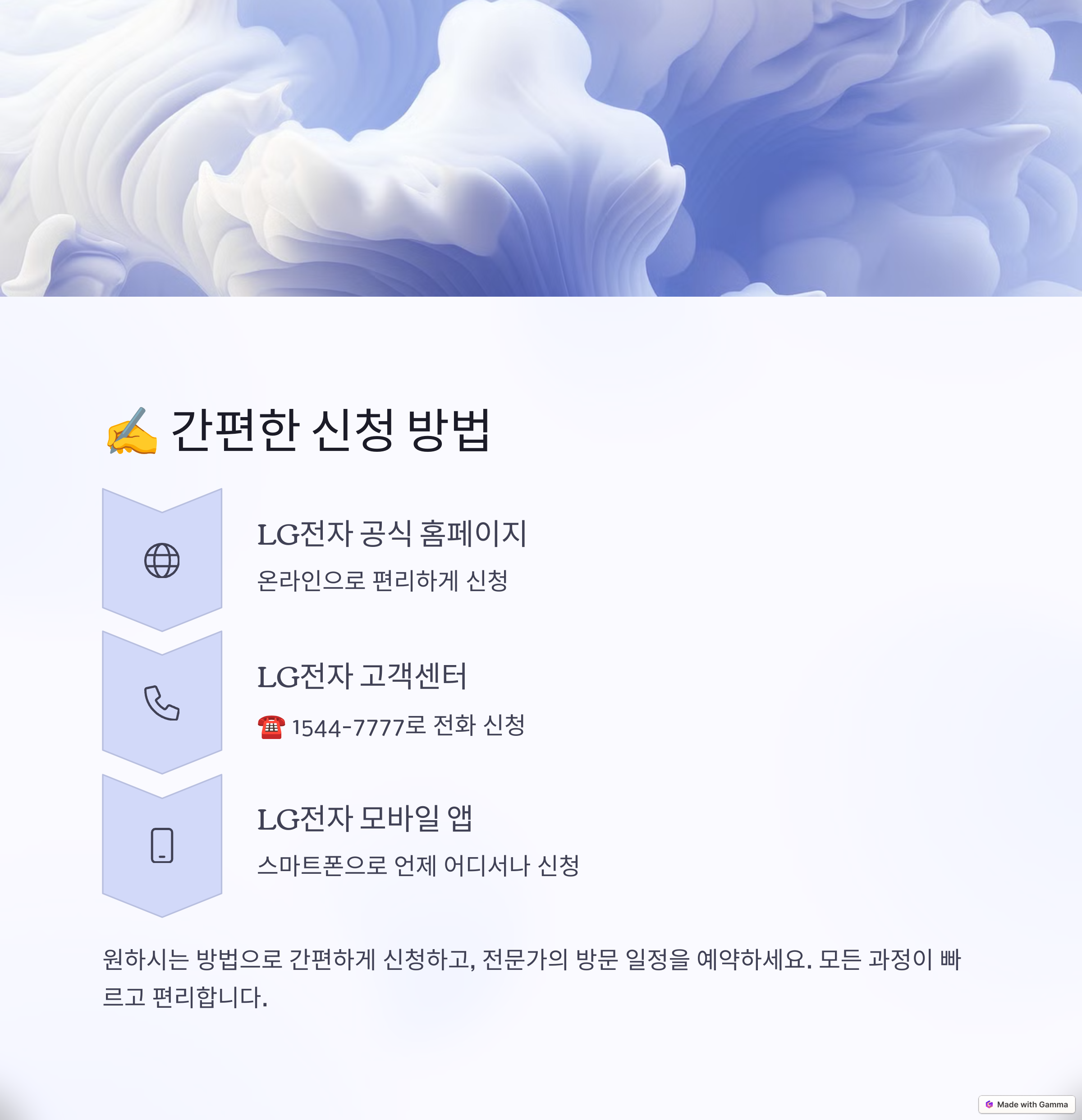 LG전자 공식 홈페이지에서 간편하게 서비스를 신청할 수 있습니다. 다음 절차를 따라 진행하세요: