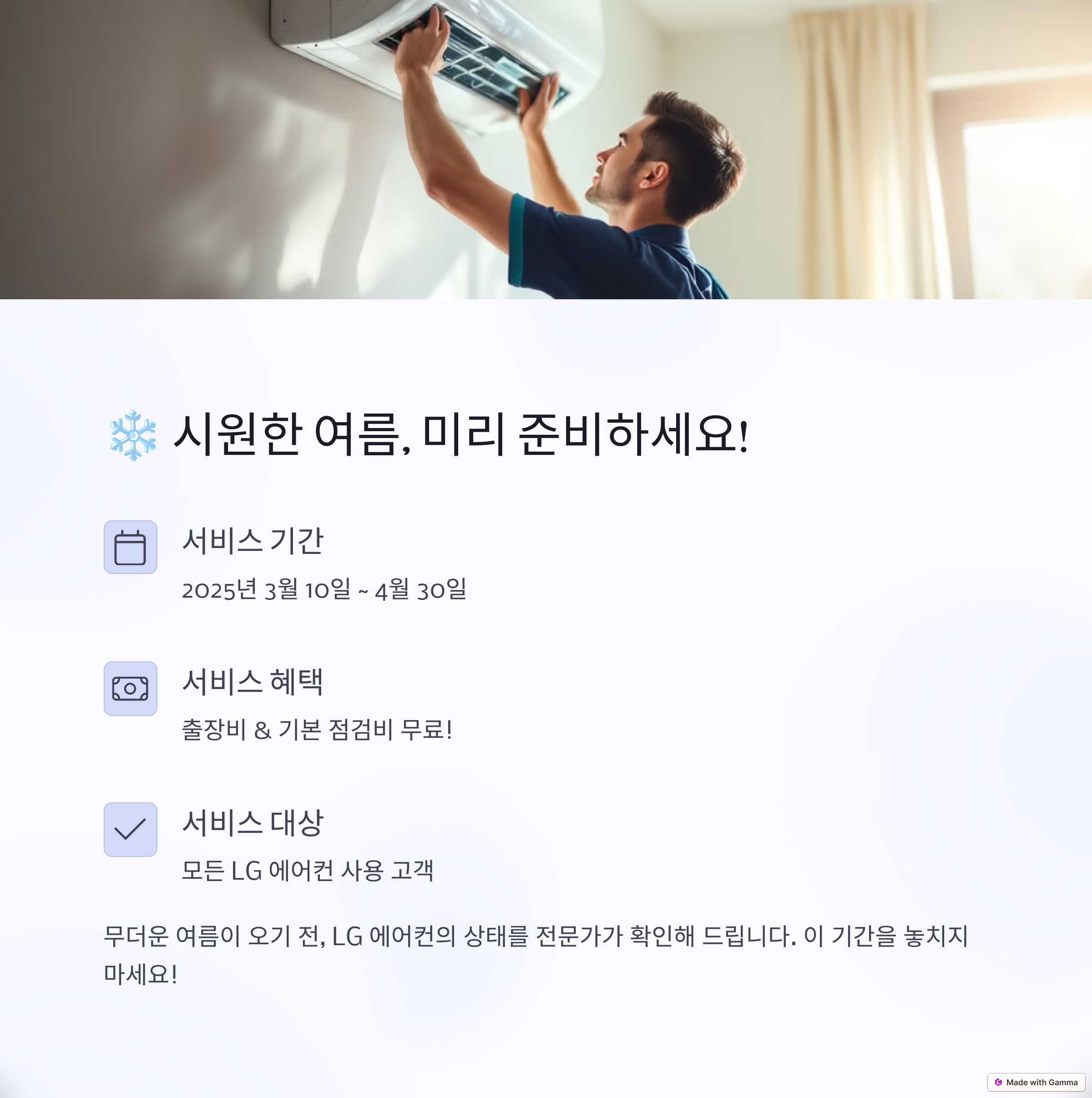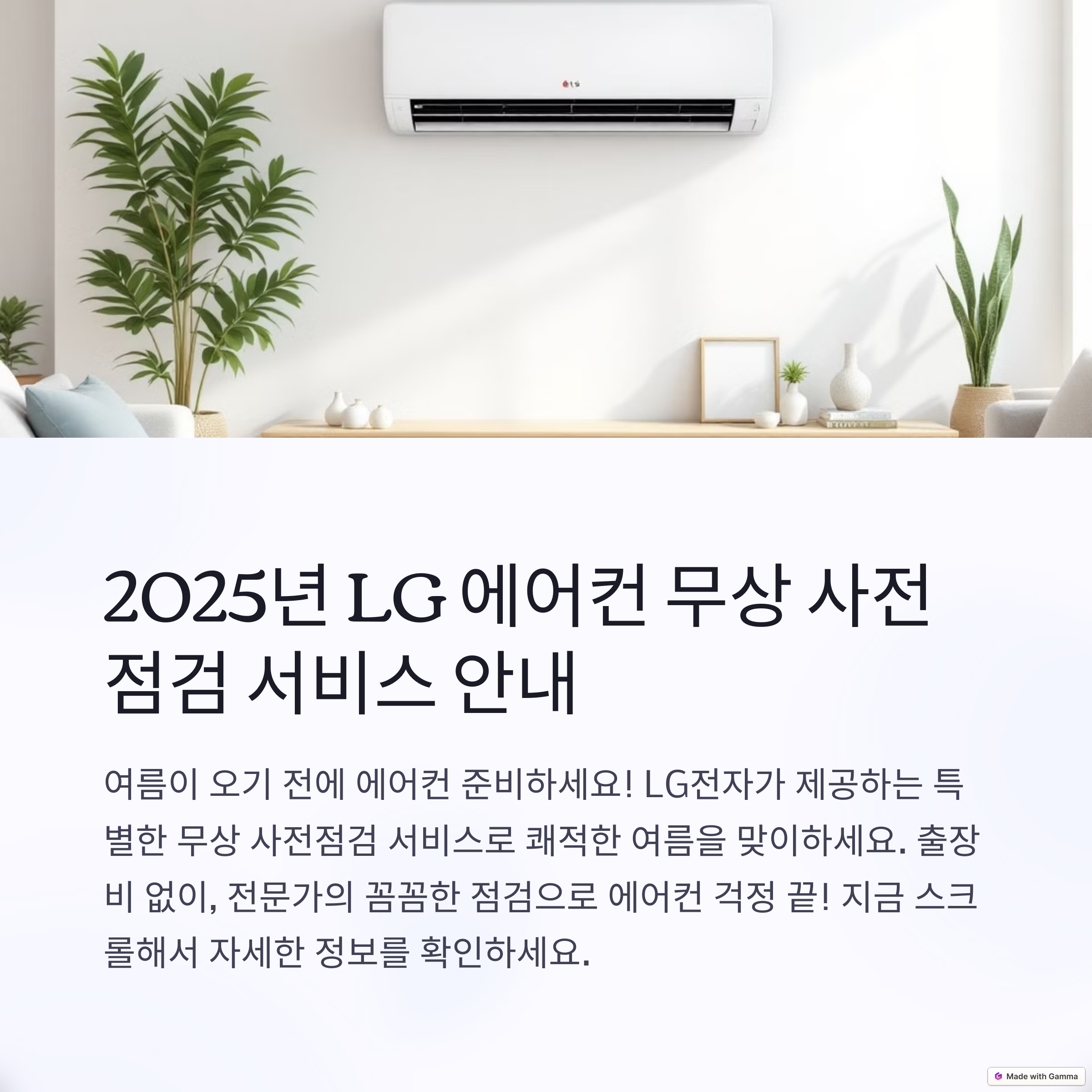 다가오는 여름철을 대비해 LG전자는 2025년 3월 10일부터 4월 30일까지 LG 에어컨 무상 사전점검 서비스를 제공하고 있습니다. 이 서비스는 출장비와 기본 점검비가 무료로 제공되며, 에어컨의 정상 작동 여부를 사전에 확인할 수 있어 여름철 고장을 예방하는 데 큰 도움이 됩니다. 아래는 신청 방법과 점검 내용에 대한 상세 설명입니다.