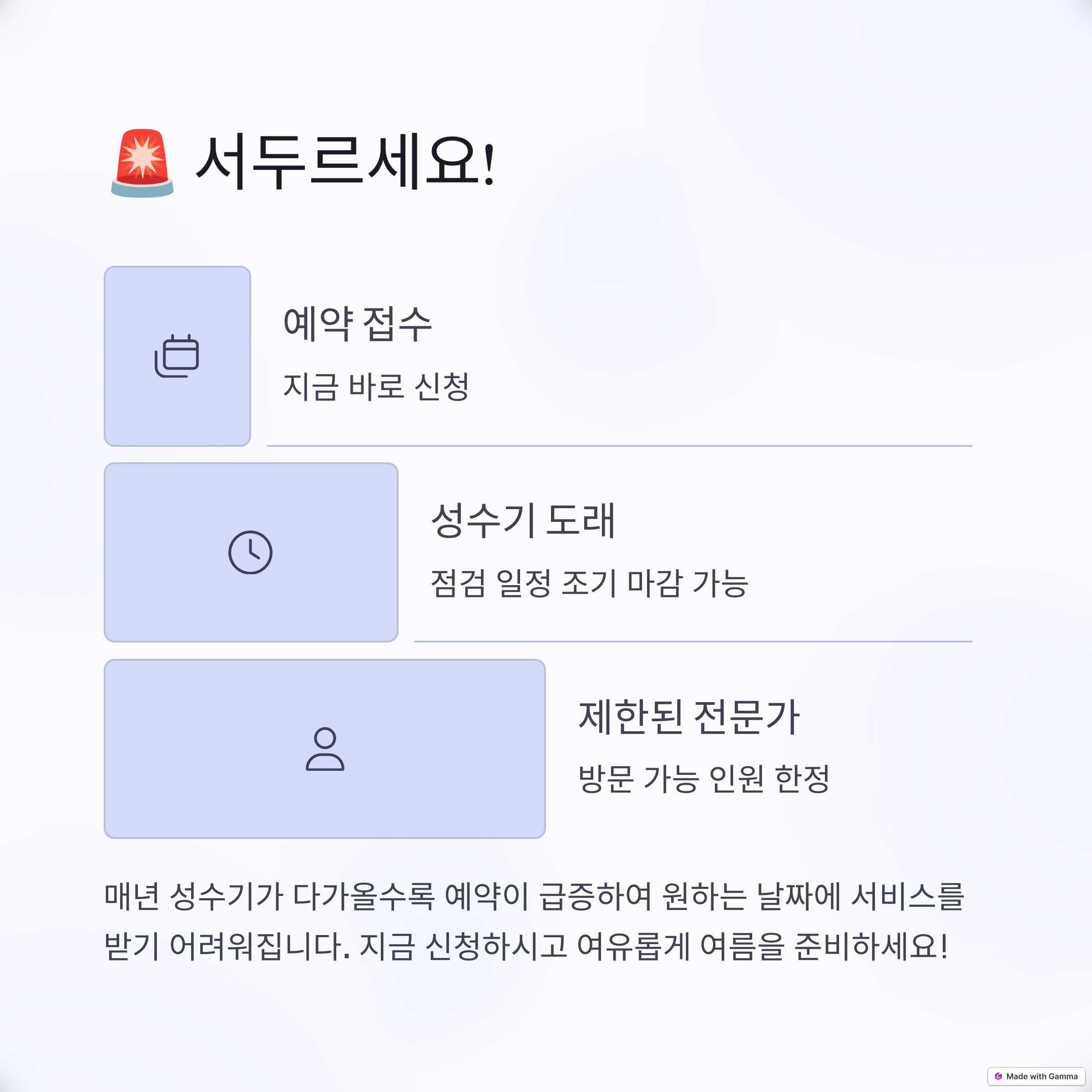 - 예약 확인: 접수 후 문자 또는 이메일로 예약 확인 메시지가 발송되며, 엔지니어가 방문 일정을 확정합니다