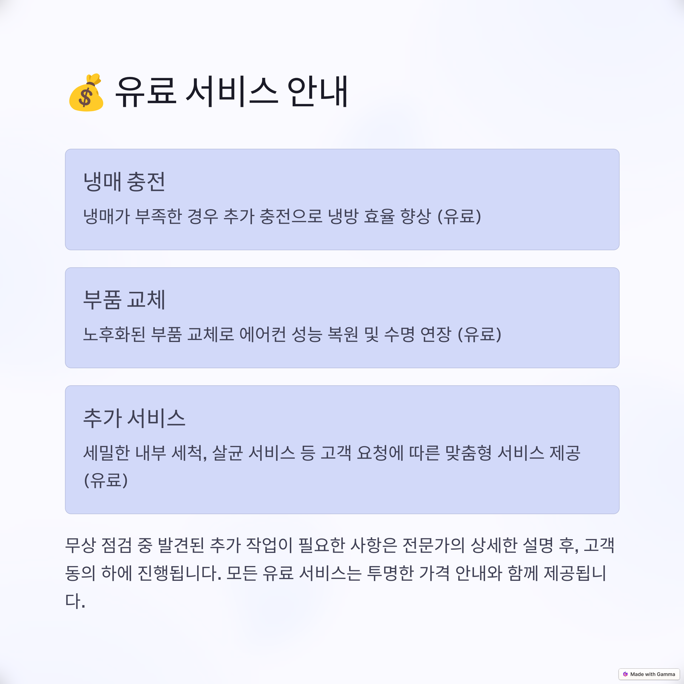- 출장비와 기본 점검비는 무료지만, 부품 교체나 냉매 충전은 별도의 비용이 발생할 수 있습니다
