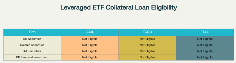 - KB증권, 신한투자증권 등: 원칙적으로 레버리지 ETF는 담보대출 불가로 운영하는 곳이 많음